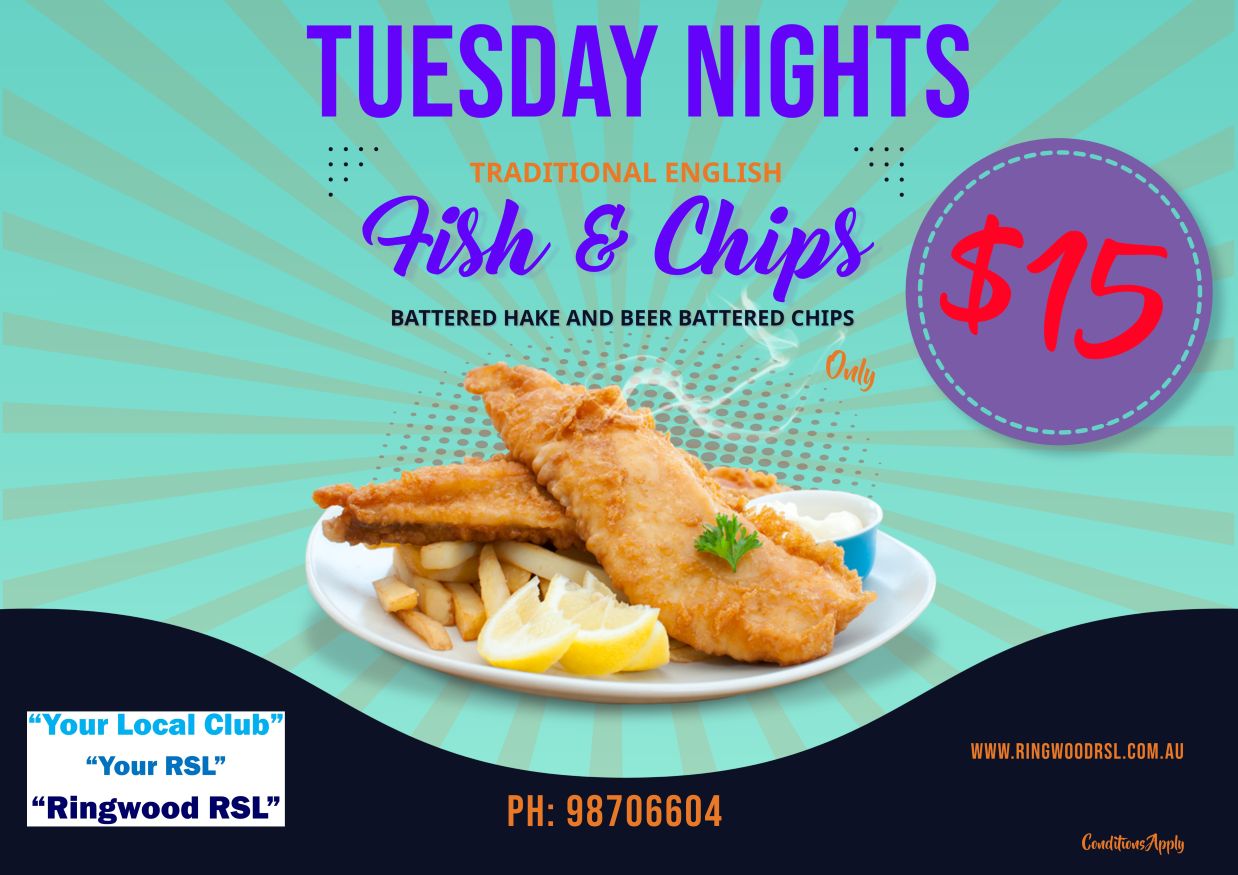 Join us on Tuesday nights for traditional English fish and chips at just $15. Savor the crispy golden fish and chips in the friendly atmosphere of Ringwood RSL Melbourne. Perfect for catching up with friends or family, this classic dish is the ideal way to start your week. Your table is ready for you!