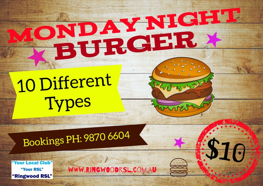 Join us every Monday night at Ringwood RSL Melbourne for burger night where you can enjoy gourmet burgers for just $10. Choose from classic beef, spicy chicken, or hearty vegetarian options made from fresh local ingredients. Bring your friends and family for a relaxed evening of great food and company, and make Monday your new favorite night out.