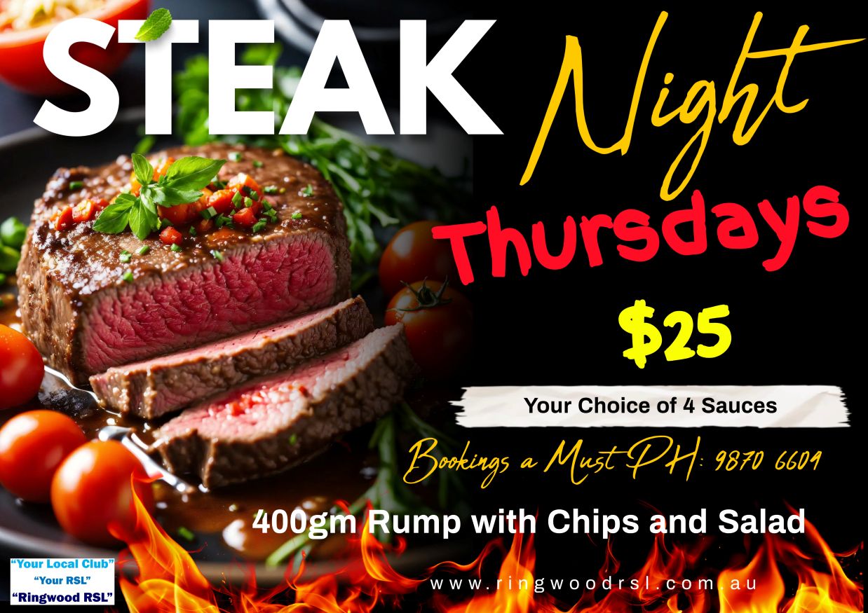 Join us every Thursday at Ringwood RSL Melbourne for Steak Night, featuring a delicious steak with chip and salad for just $25. Whether you like it chargrilled or with sauce, our chefs ensure a fantastic meal. Bring your family and friends for a mid-week treat that transforms an ordinary Thursday into a fun night filled with great food and company. Enjoy quality steak at your local club.